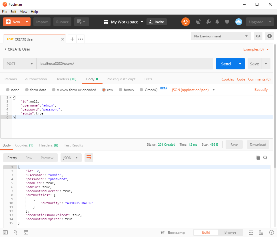 Start the application and send a POST request to the user endpoint to create a new user: