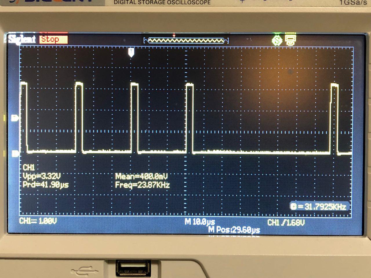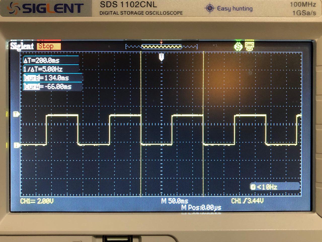 As you can see, the application simply pulls pin 5 high, waits for 100 milliseconds and then pulls the pin low again before waiting for another 100 ms. The oscilloscope measures something like this: