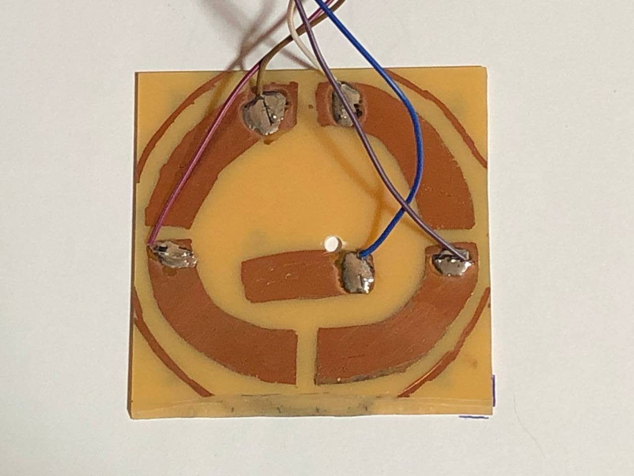 I also wanted the conductive pads to be relatively large, and the entire device should be easy to assemble, which would not be the case when using metal strips or washers. Therefore, I opted to design a small PCB that contains thick traces that act as one side of the capacitive touch sensor. When a user gets close to the PCB, the finger acts as the second plate. Having the traces on a PCB also means that assembling the device becomes much easier in the end. However, I first produced a simple prototype at home that looks like this: