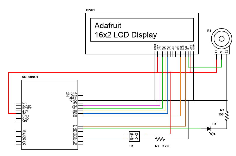 Figure 1: A simple project that utilizes a standard 16x2 character LCD. Note the large number of GPIO pins that the display occupies.