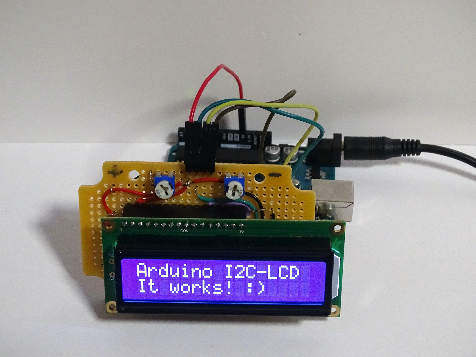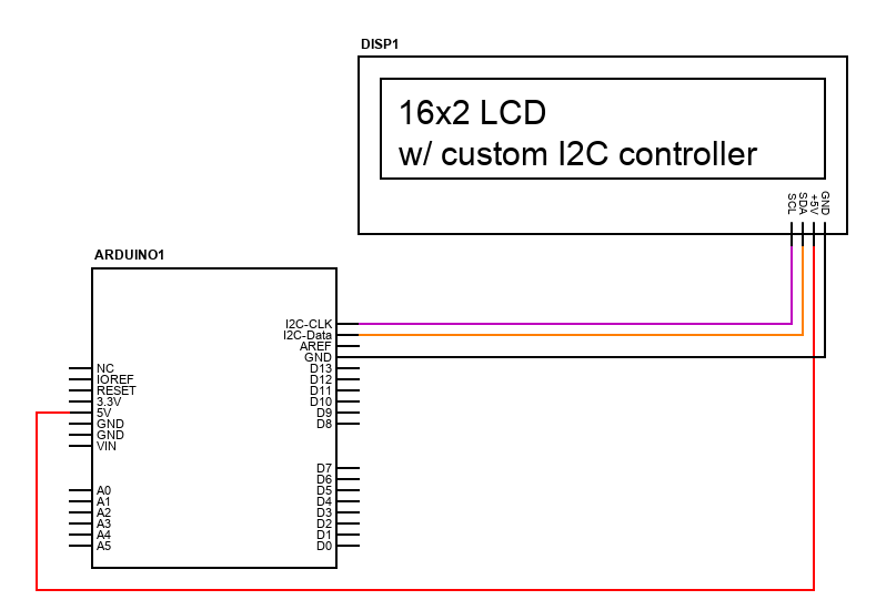 Figure 2: The goal of this project is to build a simple I2C interface that makes it easier to use standard character LC-displays with an Arduino. Note how this set up only requires two communication lines (pull-up resistors omitted) and two power wires.