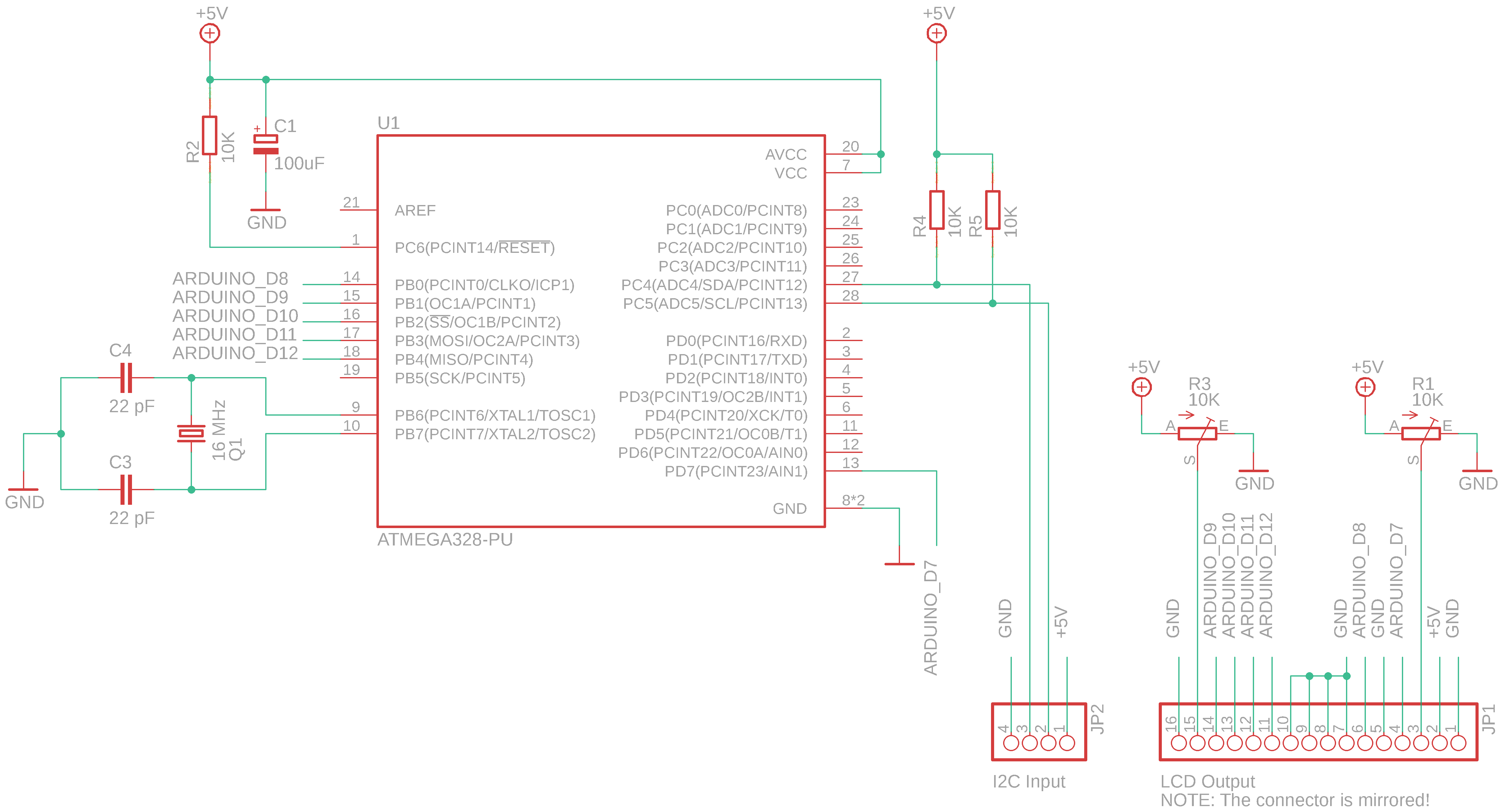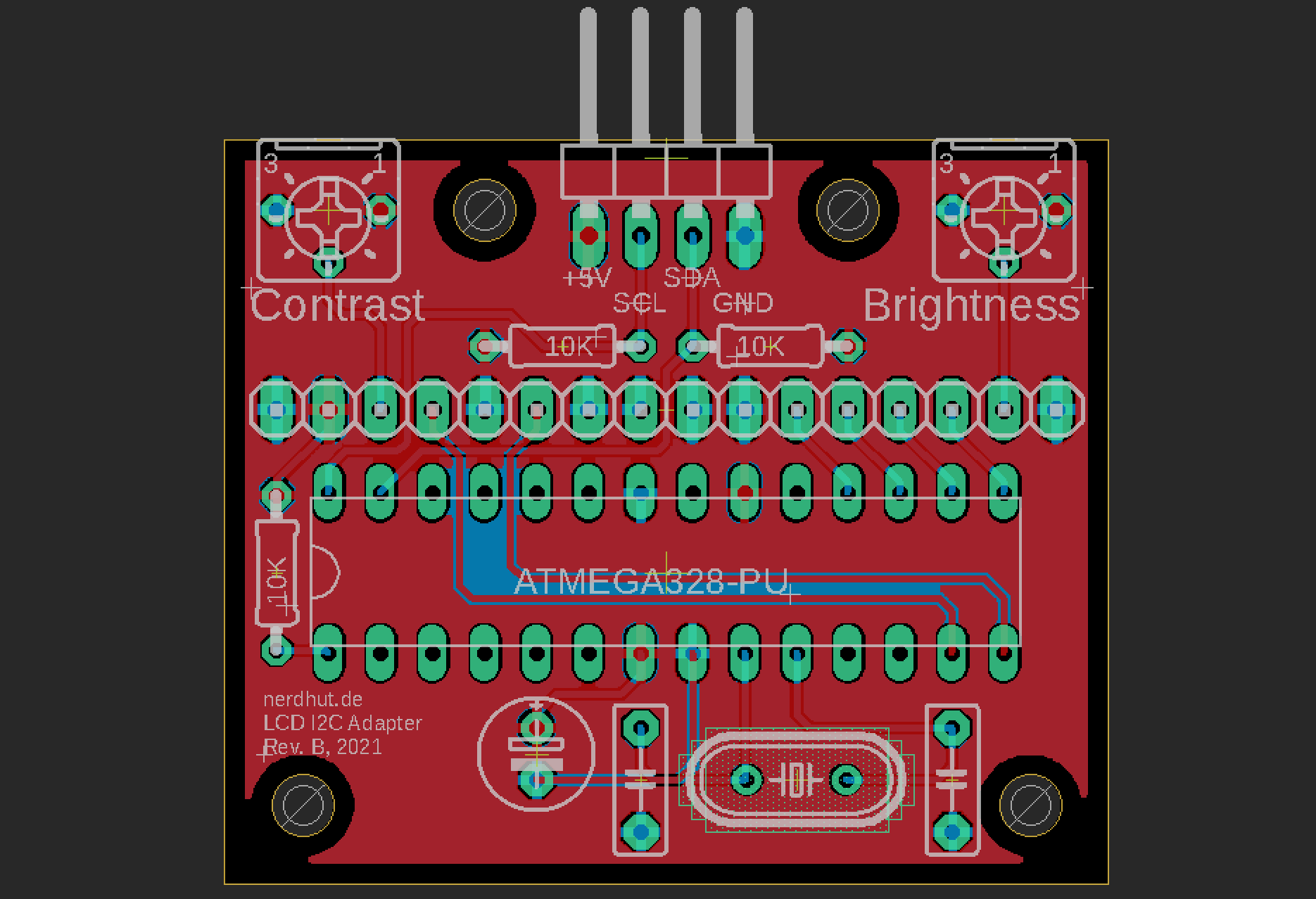 Designing such an adapter board shouldn’t be too difficult. All we need is a 16-pin header for connecting the LCD, an MCU that takes control over the display, two trimmers, and several components to make the MCU work. My idea is to outsource the LCD control functionality. Instead of letting the Arduino-board control the display, I put the second microcontroller in charge of communicating with the LCD. That second MCU receives commands from the Arduino via I2C so that it knows what to display. Note that I use the Arduino as an example here. In reality, you can use any other I2C compatible device. In addition to reducing the number of wires, this approach also has the added benefit of making the main MCU easier to program, especially if there’s no readily available LCD control library that you can use. As long as the MCU supports I2C, you’re good to go because the secondary controller takes care of communicating with the display.