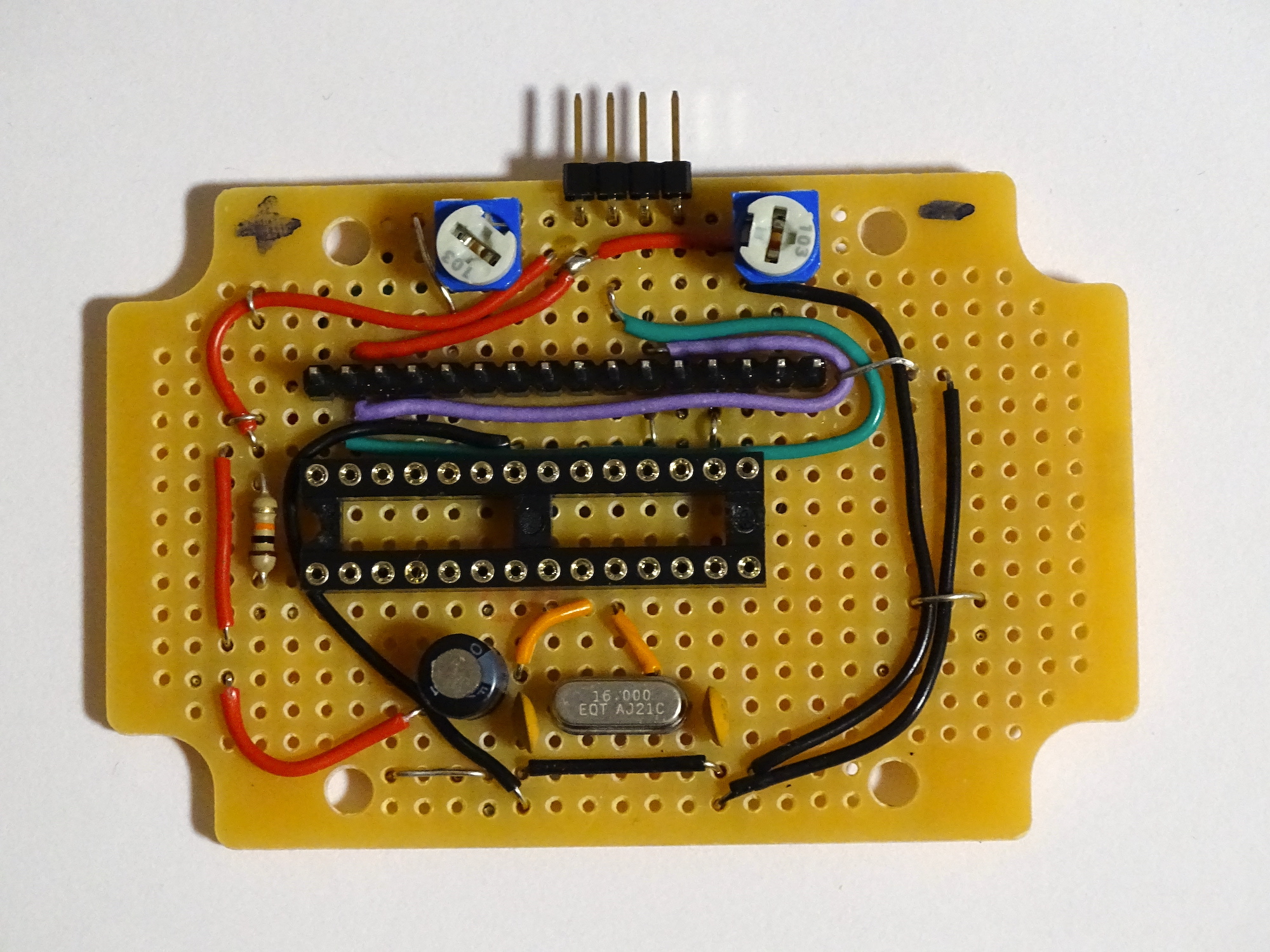 Note that fig. 4 shows revision B of the board. In the first revision, I forgot to include the I2C pull-up resistors, and that design relied on external components. However, as the entire goal of this project is to reduce the need for external components, I included the pull-up resistors in the PCB design. According to a discussion I linked below, the ATMega328PU, combined with the Arduino Wire library, uses internal pull-up resistors on the I2C lines. Therefore, you can omit the two 10K resistors between the two trimmers. Either way, here’s an image of the prototype that I assembled on a piece of perfboard: