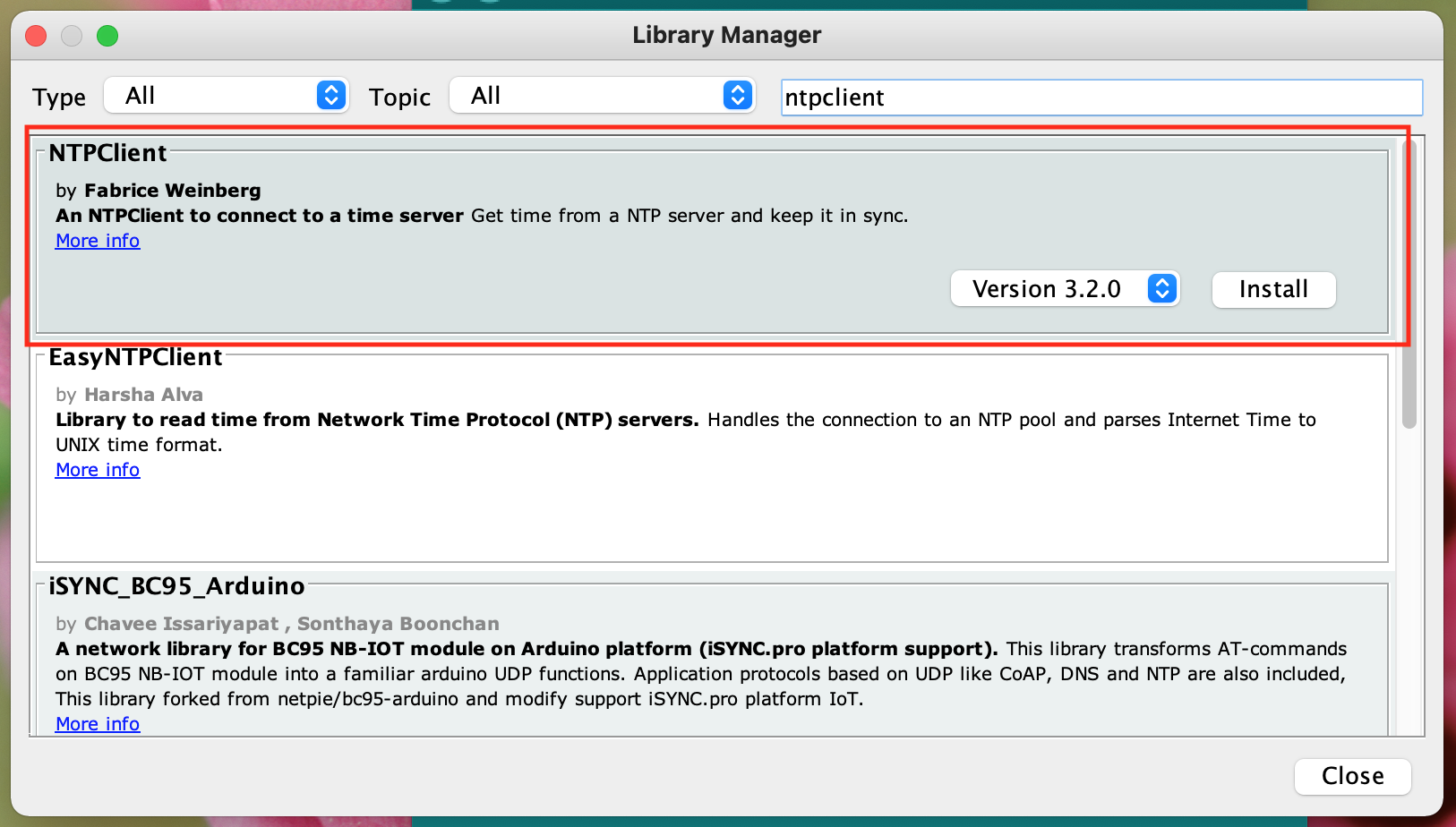 Figure 1: Install the NTPClient library using the Arduino IDE’s built-in library manager