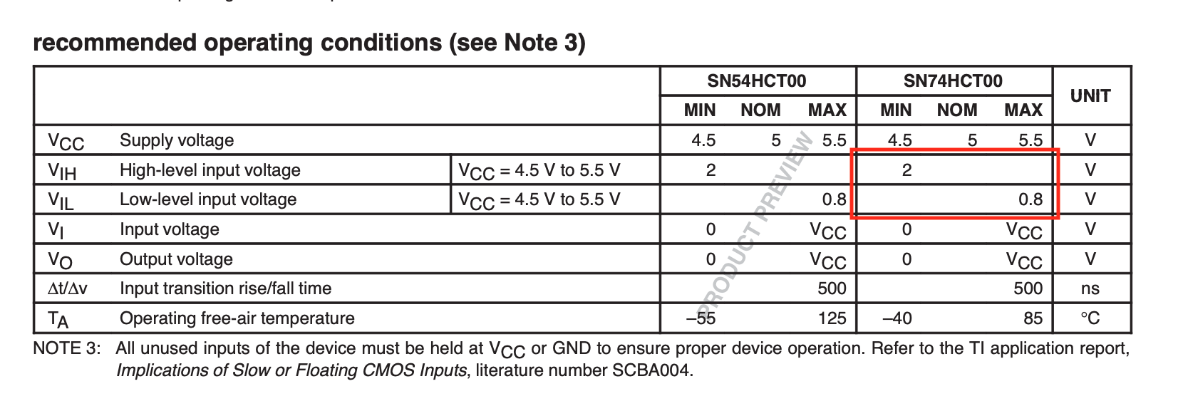 Figure 1: A screenshot of the 74HCT00 NAND-Gate datasheet. The red square outlines the relevant values. An input above two Volts is considered HIGH, every input voltage below 0.8V is considered to be LOW. The chip’s behavior between those values is not deterministic.